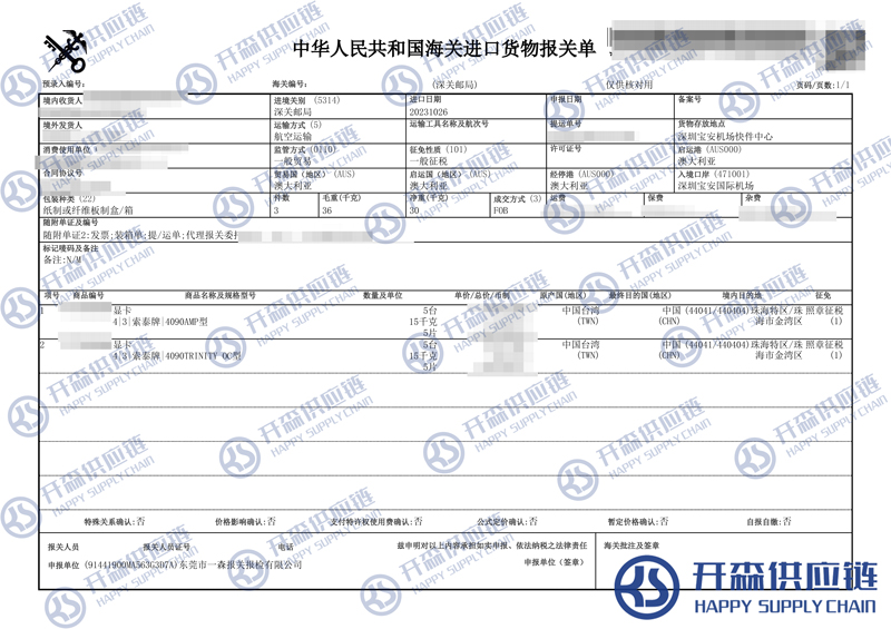 開森進口供應鏈擁有高端顯卡進口報關操作經驗及案例,十余年操作經驗及案例可供參考,可按需定制高端顯卡進口方案,幫助客戶解決進口難題,快速進口清關到港到貨。